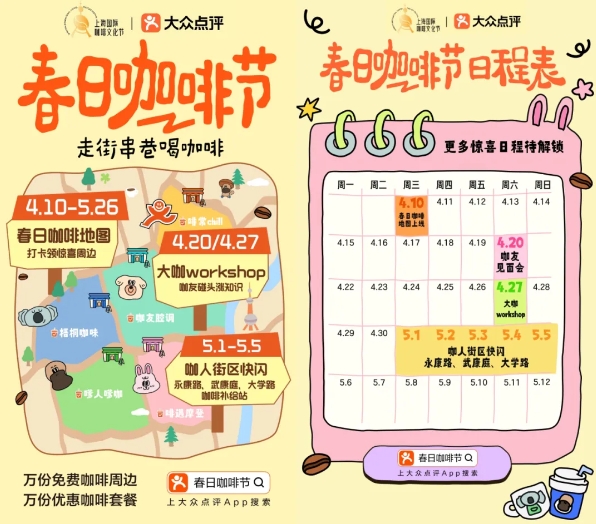 大众点评推出“春日咖啡节”系列活动,上线“春日咖啡地图”,并在永康路、武康路、大学路等区域打造春日咖啡节主题街区,同步推出线上咖啡节限定超低折扣。