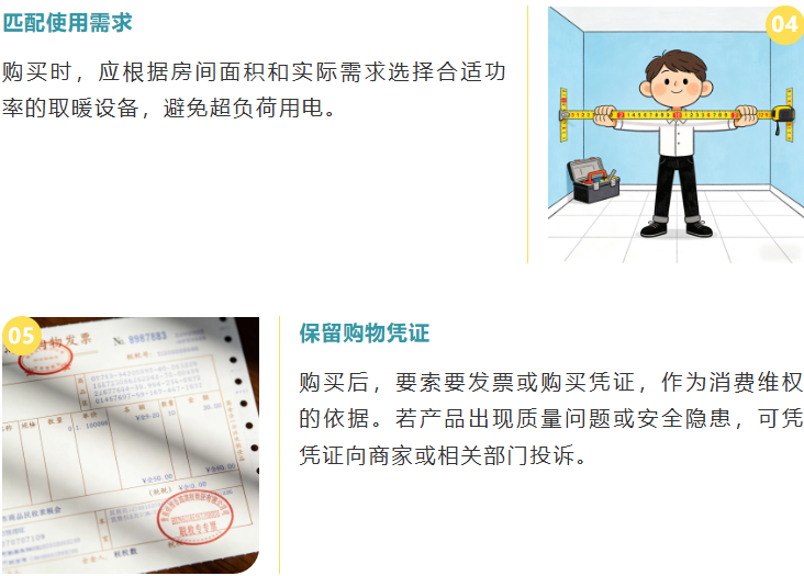 注意取暖产品的使用年限,如果使用年限过长,其安全性能会降低,容易引发安全事故。在取出设备使用时,要检查设备是否超过使用期限。