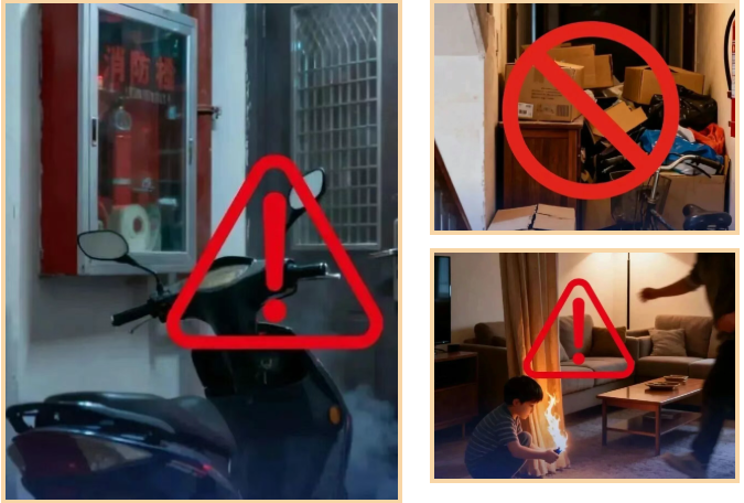 严禁电动自行车(含电池)进楼入户,在公共门厅、疏散通道、楼梯间、安全出口等处停放或充电。