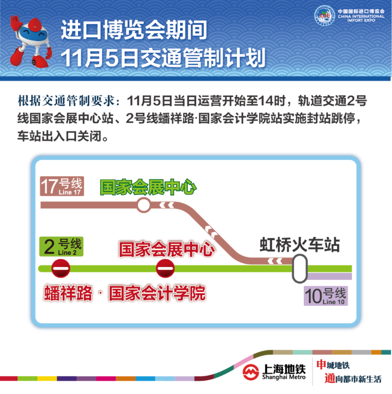 此外,11月5日当日运营开始至14时,轨道交通2号线国家会展中心站、2号线蟠祥路·国家会计学院站实施封站跳停,车站出入口关闭。需前往国家会展中心的乘客可到17号线国家会展中心站下车。详见↓