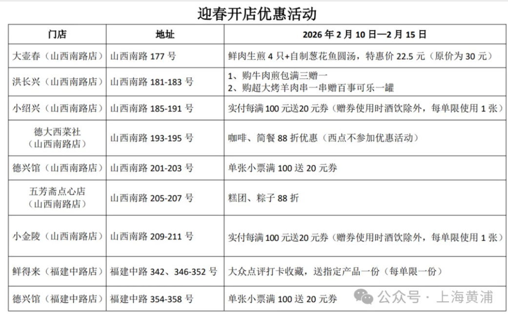 为保障老字号持续经营、守护品牌生命力,此次过渡经营场地由杏花楼集团统筹推进。目前,场地整体加固已完成并通过验收,旗下各老字号店铺内装工作正稳步推进,预计1月底全部完成。届时,鲜得来、德兴馆将入驻福建中路,大壶春、洪长兴、小绍兴、德大、五芳斋、小金陵等品牌则集中落户山西南路(南京东路-天津路)。2月10日—2月15日,相关店家将推出开业迎春促销活动。