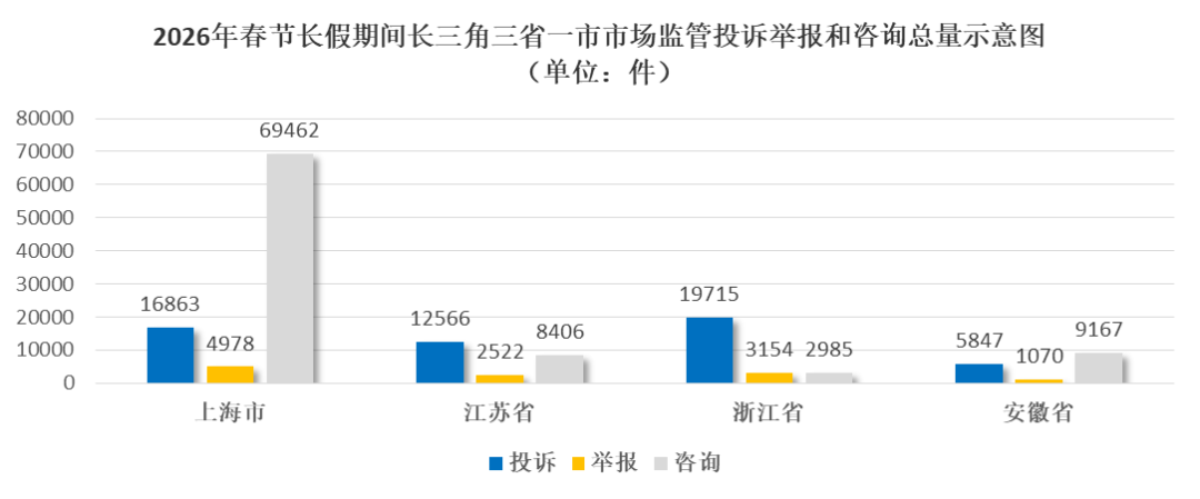 市市场监管局介绍,2026年春节长假期间三省一市市场监管投诉举报系统共接收投诉54991件、举报11724件,解答咨询90020件。其中,上海市市场监管部门接收投诉16863件、举报4978件,解答咨询69462件;江苏省市场监管部门接收投诉12566件、举报2522件,解答咨询8406件;浙江省市场监管部门接收投诉19715件、举报3154件,解答咨询2985件;安徽省市场监管部门接收投诉5847件、举报1070件,解答咨询9167件。