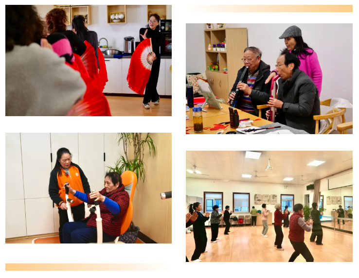 活动室里,老人们三三两两聚在一起:有的在指导下使用康复器械,有的正跟着老师学习舞蹈、操练太极,悠扬的电吹管声从角落轻轻流淌。