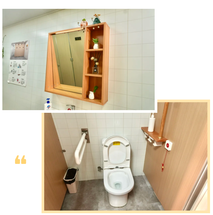 卫生间的台盆和镜柜都经过适老化改造,镜子特意倾斜,方便坐轮椅的老人使用。马桶旁装有牢固的扶手和SOS紧急呼叫装置,遇到情况,一拉就能及时呼救。