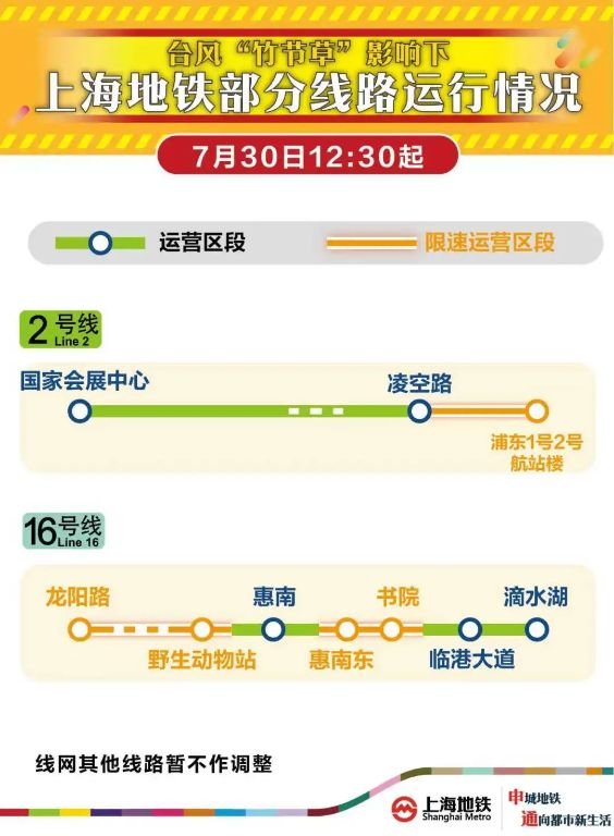 申通地铁集团介绍,受台风“竹节草”影响,为确保轨道交通运营安全,今日(7月30日)12时30分起,【2号线浦东1号2号航站楼站至凌空路站】,以及【16号线地面高架段】列车限速运行。