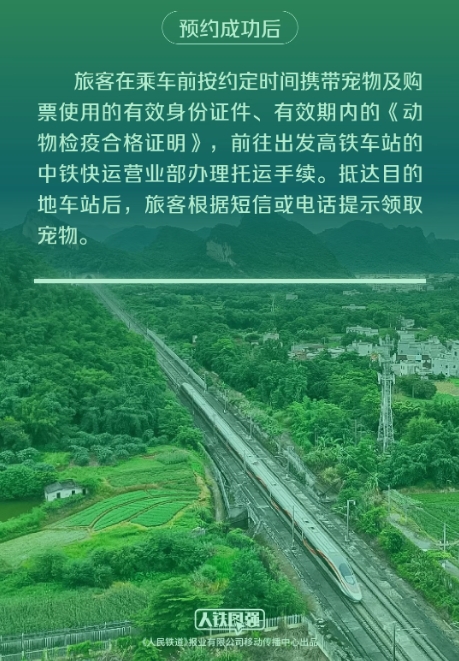 试点高铁宠物托运服务实行“人宠同出发、同到达”规则,旅客可通过铁路12306客户端“宠物托运”功能查询对应车次,提前2天及以上购买车票并线上预约同车托运宠物服务。预约成功后,旅客在乘车前按约定时间携带宠物及购票使用的有效身份证件、有效期内的《动物检疫合格证明》,前往出发高铁车站的中铁快运营业部办理托运手续。抵达目的地车站后,旅客根据短信或电话提示领取宠物。