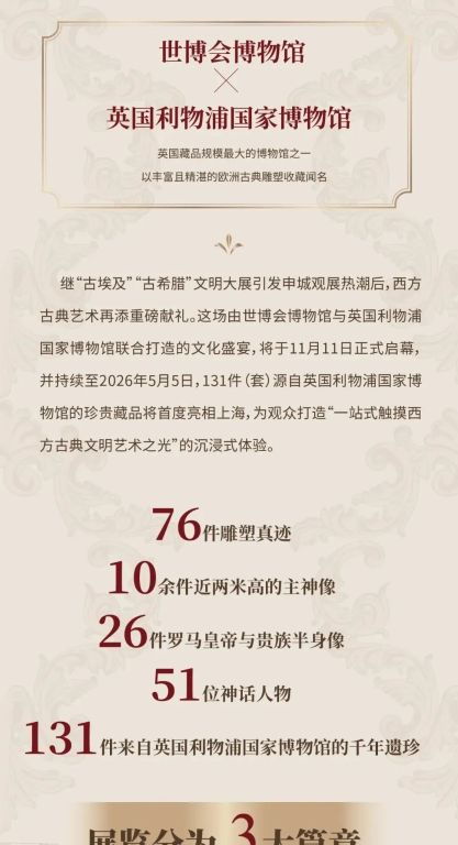 市文化旅游局介绍,由世博会博物馆与英国利物浦国家博物馆联合打造的文化盛宴,将于11月11日正式启幕并持续至2026年5月5日,131件(套)源自英国利物浦国家博物馆的珍贵藏品将首度亮相上海,为观众打造沉浸式体验。明天15:00,各大票务平台将发售秒杀票。详见↓