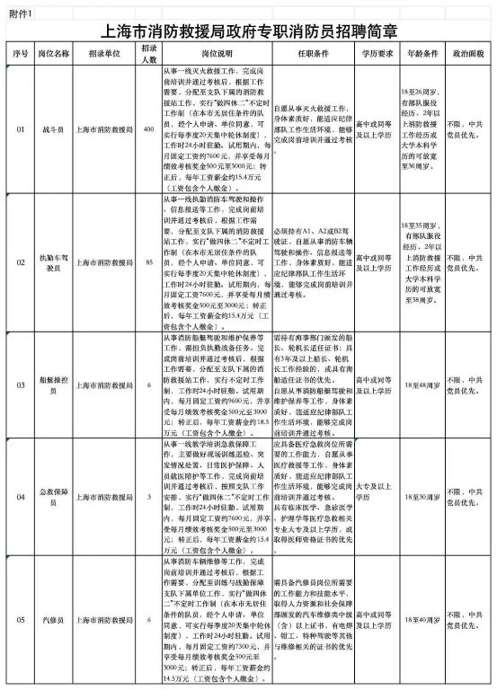 上海市消防救援局介绍,面向社会公开招聘500名政府专职消防员,包括战斗员400名、执勤车驾驶员85名、船艇操控员6名、急救保障员3名、汽修员6名。2026年3月13日09:00至3月25日16:00,通过上海消防招聘管理平台(https://zp.shxf-119.com)查询报名。