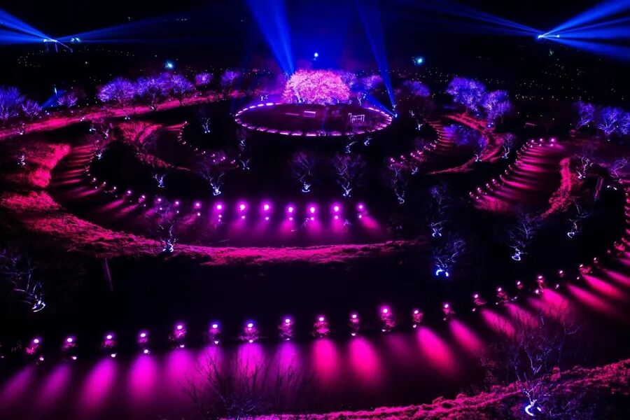 当暮色降临,白日的清雅梅园瞬间变身流光溢彩的梦幻世界。园区以梅园中心的“梅王”为圆心,在横跨200亩的梅林间铺展开一场声势浩大的光影盛宴,上千组多色LED帕灯与树灯点亮林间水岸,100瓦激光矩阵与500瓦电脑光束灯纵横交织,配合上千颗弹球灯点缀其间,在梅溪香岭、梅影曲径、梅宫探梅三大片区铺展出层次丰富的立体光域,整片梅林仿佛被光影重新雕琢。