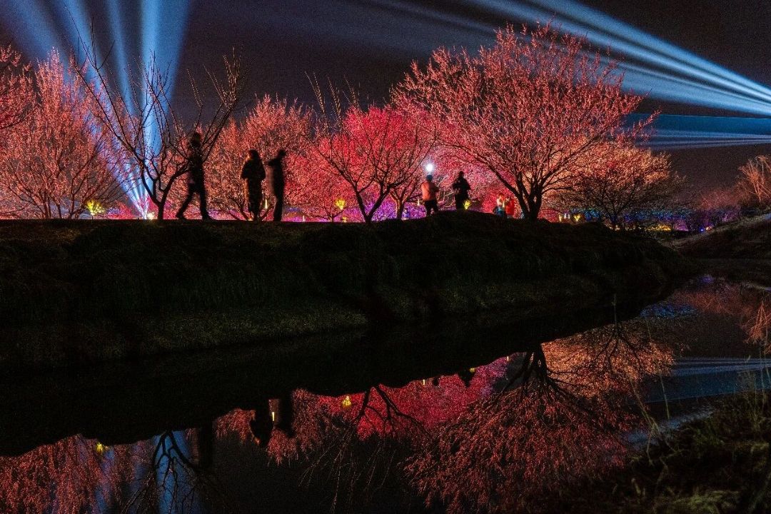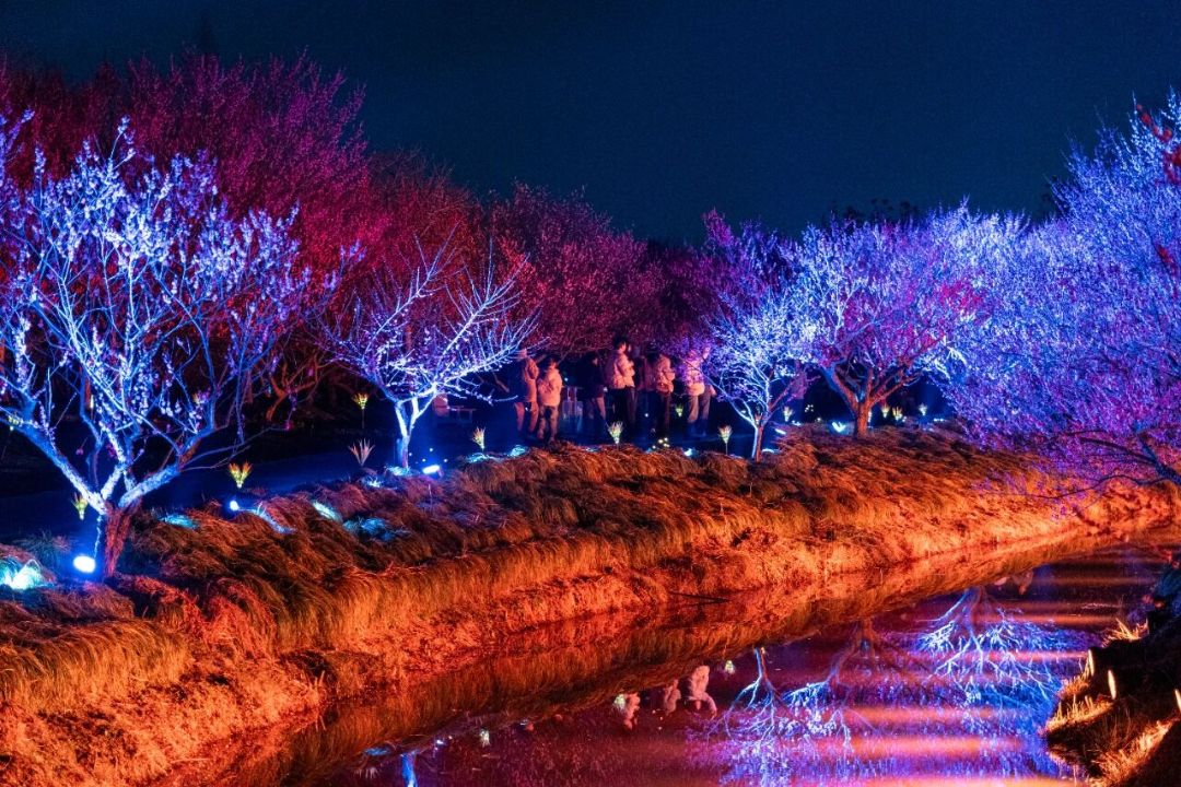 园区现有梅花30000多株,涵盖宫粉、朱砂、绿萼、美人梅、江梅等五大类60多个品种,眼下正值盛花期,漫步梅林,暗香浮动,疏影横斜间勾勒出江南早春的诗意画卷。而今年的重头戏在夜晚……