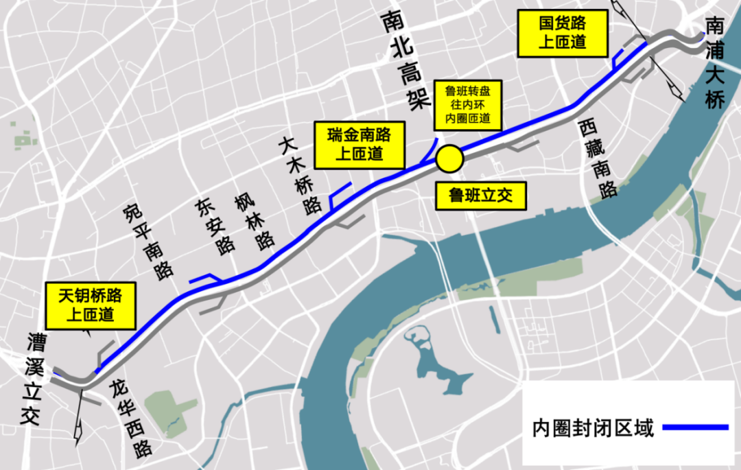 周一至周日夜间24时至次日晨6时内环高架(南浦大桥至龙华西路)内圈主线封闭,鲁班转盘往内环内圈匝道封闭。