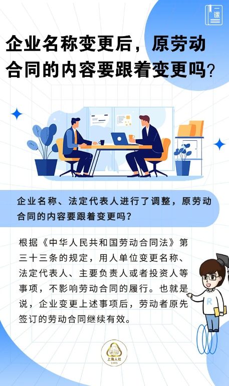 小钱去年7月入职一家户外用品公司。上周,公司给所有员工发了邮件,说是企业名称、法定代表人等都将进行变更,望全体员工知悉。有同事“吐槽”,这公司名字一换,怕不是劳动合同也要跟着变更吧!小钱刚在职场站稳脚跟,对此不免有些担心。企业名称调整后,原劳动合同的内容会跟着变更吗?