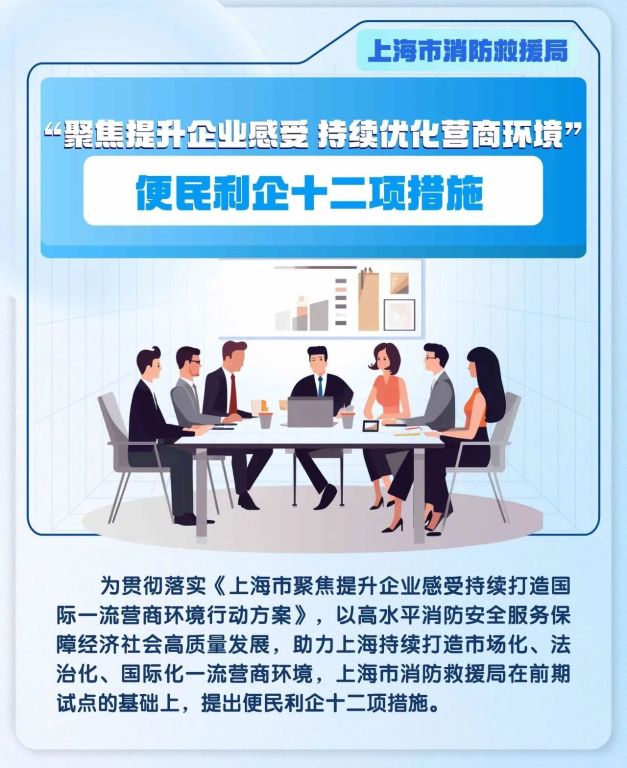 市消防局、市发展改革委介绍,为贯彻落实《上海市聚焦提升企业感受 持续打造国际一流营商环境行动方案》,以高水平消防安全服务保障经济社会高质量发展,助力上海持续打造市场化、法治化、国际化一流营商环境,上海市消防救援局在前期试点的基础上,提出便民利企十二项措施。详见↓