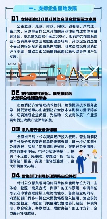 1. 在提升消防许可办理质效,支持企业落地发展方面,公众聚集场所在投入使用、营业前办理消防安全检查,这是消防部门法定的许可事项,围绕提升许可办理质效,推出三项措施: