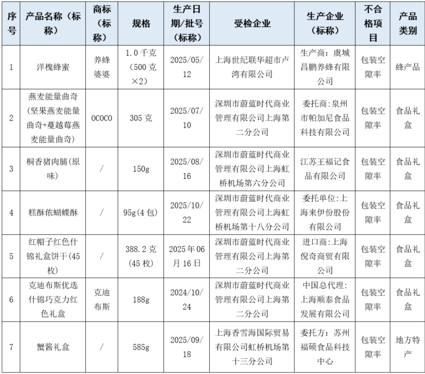 市市场监督管理局介绍,近期,上海市市场监督管理局对本市生产领域和流通领域(含电商平台)的蜂产品、食品礼盒和地方特产开展了商品包装物减量(过度包装)监督抽查。本次共抽查70批次,其中合格63批次,7批次涉嫌不合格,不合格发现率为10%。详见↓