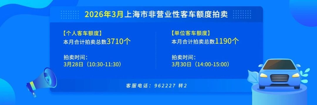 上海国拍公司今天发布,3月份个人车牌拍卖将于3月28日(10:30-11:30)举行,本月个人客车额度合计拍卖总数3710个。警示价为92900元,拍卖系统网址:https://paimai.alltobid.com,客服电话:962227。