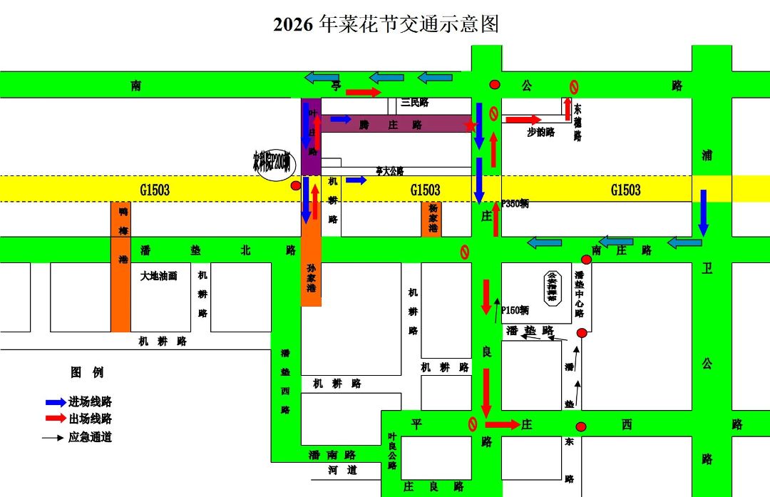 为保障通行效率,活动区域周边实施临时交通管控,请广大驾驶人按照以下指定路线有序进场、离场,合理规划行车路径。
