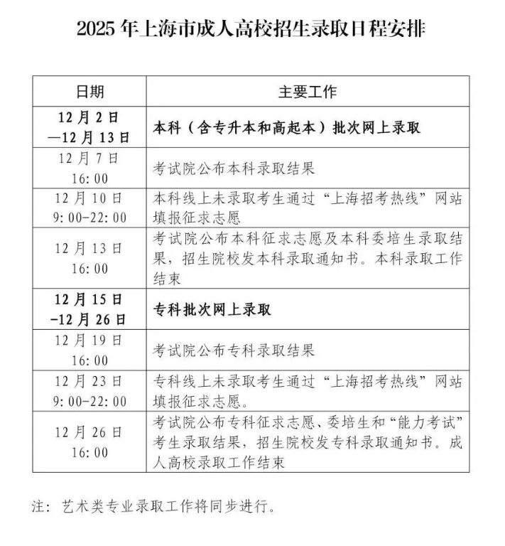 市教育考试院介绍,2025年上海市成人高校招生录取工作将于2025年12月2日至2025年12月26日进行。录取将分为两个批次三个层次进行:本科批次(含高中起点升本科、专科起点升本科层次)和专科批次(高中起点升专科层次)。考生可根据录取日程安排,及时查询录取结果和了解征求志愿等信息。