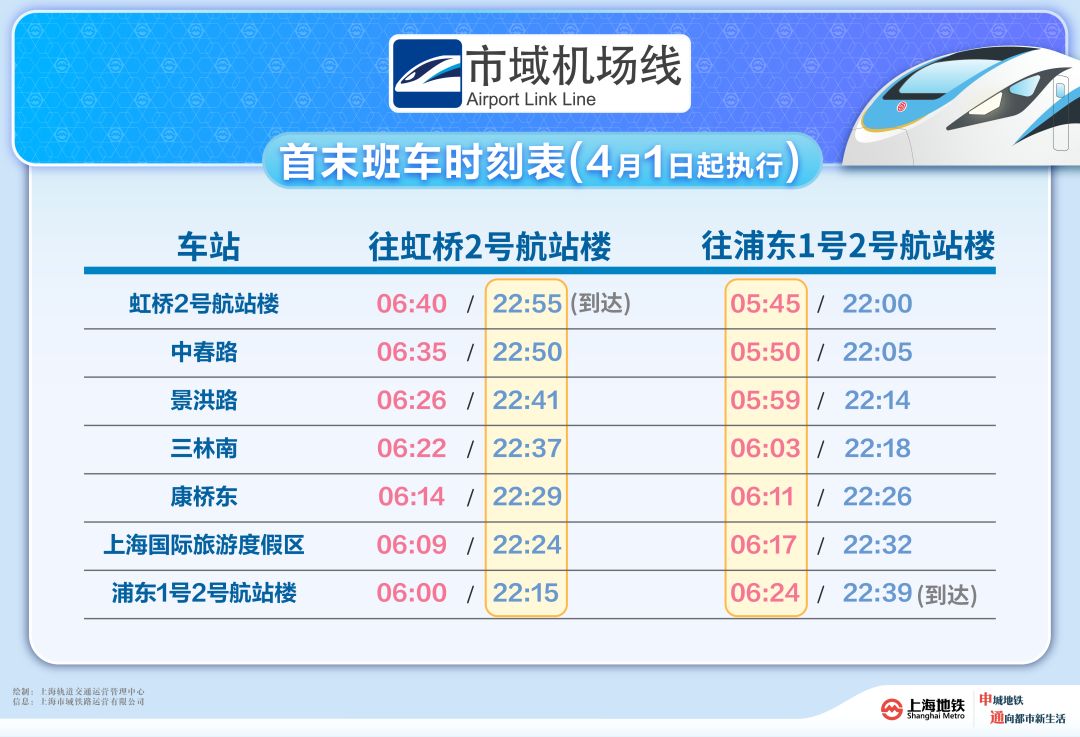 申通地铁集团介绍,为进一步适应市域机场线客流变化,提升乘客出行体验,2026年4月1日起,上海轨道交通市域线机场联络线(简称“市域机场线”)将启用新版列车运行图,对首末班车时间进行调整优化,较之前全天多运营30分钟。