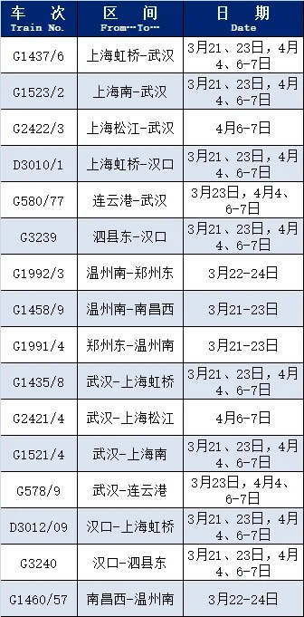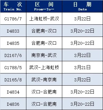 中国铁路上海局集团有限公司介绍,根据旅客出行需求,铁路部门恢复和增开了部分旅客列车,恢复开行列车包括G1437/6(上海虹桥-武汉)、G1523/2(上海南-武汉)等;增开列车包括G1786/7(上海虹桥-武汉)、D4833(合肥南-汉口)等。赶快过来看看,有没有您需要的车次。