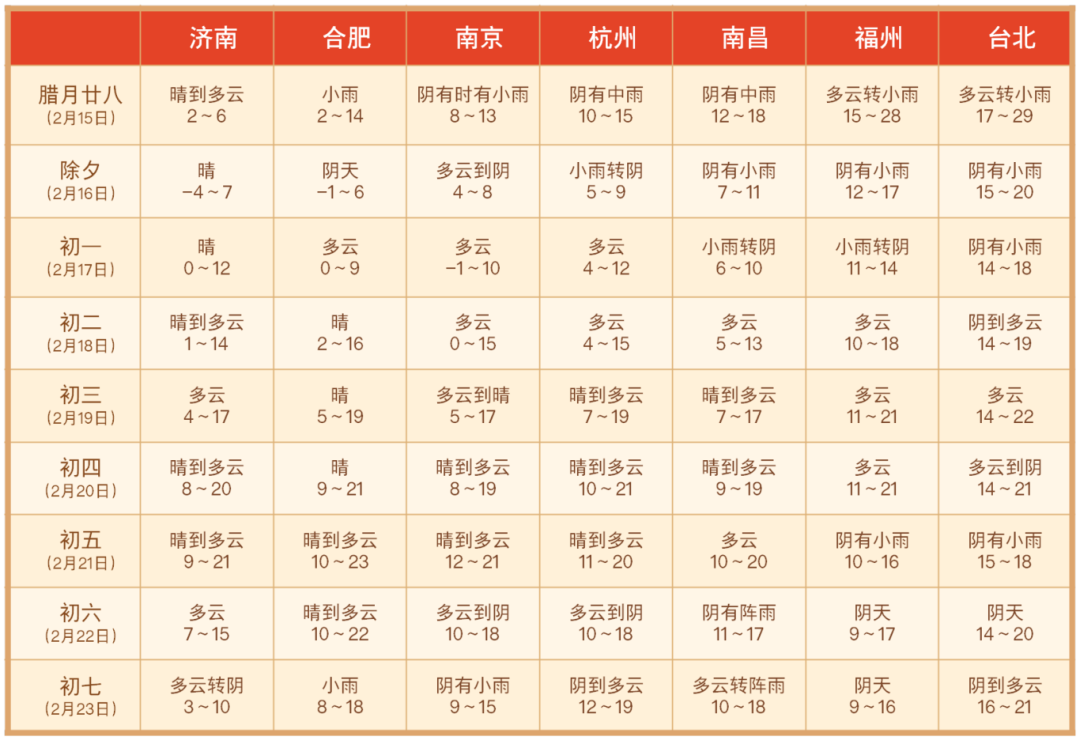 春节期间两头雨,中间多云到晴,整体气温偏高,气象条件总体适宜。