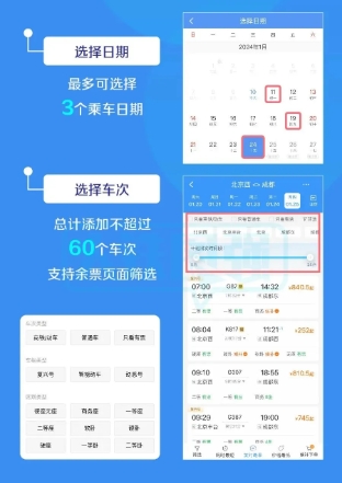 ◆ 旅客提交候补订单时,旅客可选择预售期内任意3个乘车日期,累计最多可选择60个“日期+车次”的组合,每个车次可选多个席别。