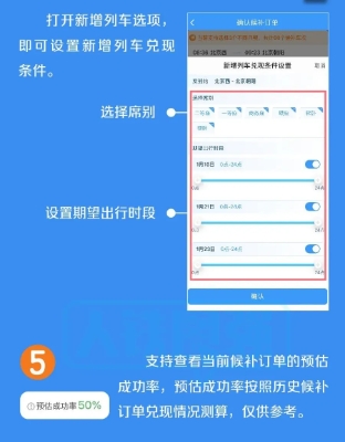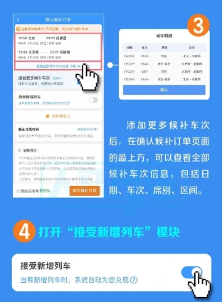 ◆ 临时新增旅客列车席位优先配售给已提交候补订单的旅客。旅客在提交候补订单时,可选择接受购买符合出行需求的新增旅客列车车票,如铁路部门临时新增旅客列车,在车票起售时,铁路12306将自动优先配售给已提交候补订单的旅客,旅客无需人工查询增开列车信息再购票。